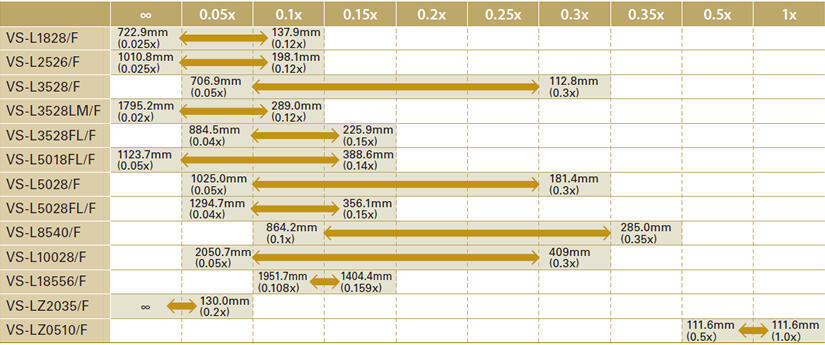 | VS-L5028/F | 50 | 0,05x-0,3x | 3,1-3,8 | F-Mount | Φ45 | ne |