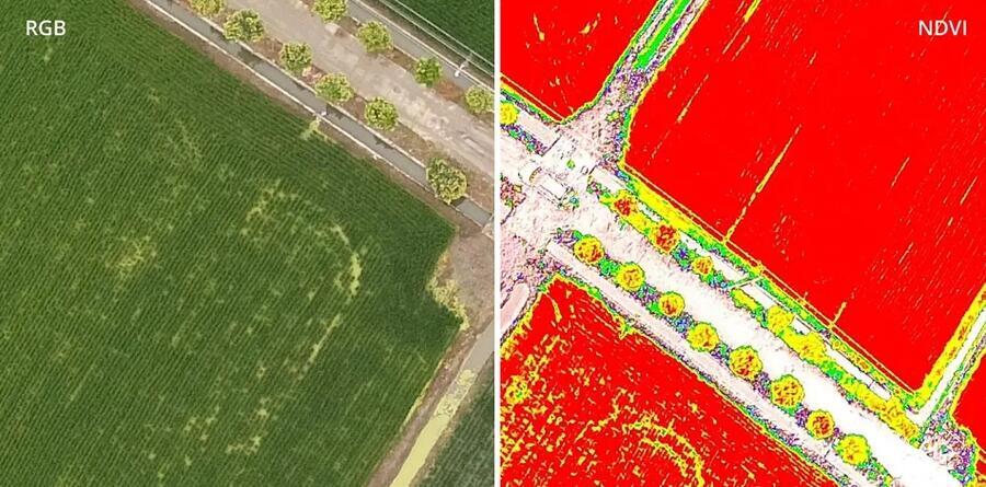 Živý náhľad z kamery dronu DJI P4Multispectral klasické vs v NDVI indexu.